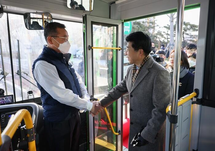 | ▲ 마을버스 개통식에서 서강석 구청장이 운전기사와 인사 나누고 있다. (사진=송파구청 제공) |
