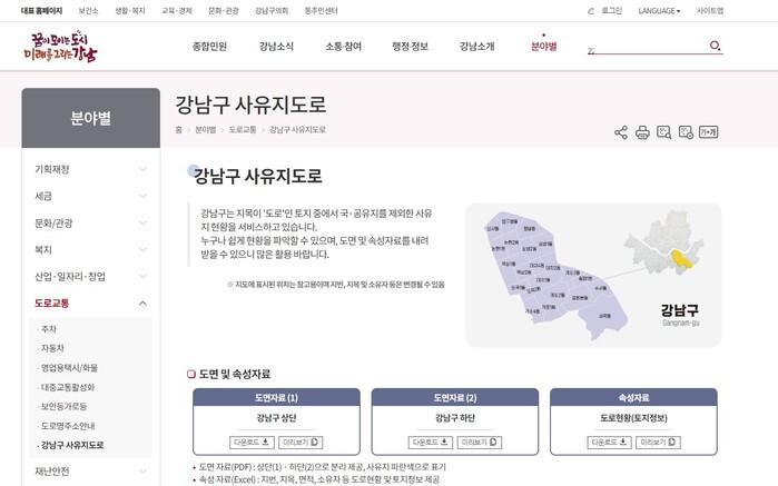 이 자료는 ‘강남구청 홈페이지→분야별→도로교통→사유지 도로’ 메뉴에서 확인할 수 있다. 웹에서 지도를 클릭해 내용을 바로 확인할 수 있고, PDF파일의 전산 도면과 엑셀로 정리된 토지 속성정보를 내려받을 수도 있다.