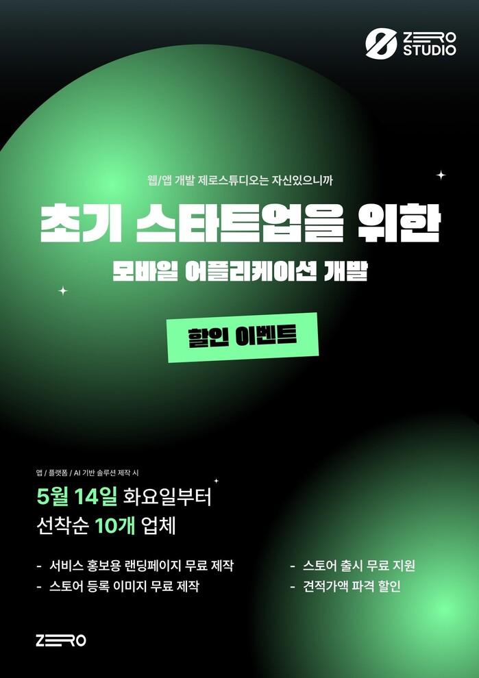 앱·플랫폼·AI 기반 솔루션 개발 전문기업 제로스튜디오(ZERO STUDIO)는 본격적인 정부지원사업 시작 기간인 5월을 맞아 스타트업 대상 모바일 어플리케이션 개발 할인 이벤트를 진행한다고 14일 밝혔다.