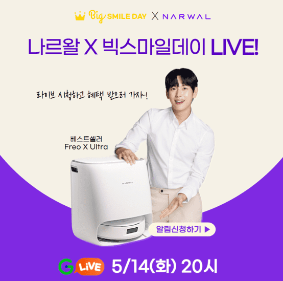 나르왈은 7일부터 20일까지 진행하는 이번 지마켓 빅스마일데이에서 나르왈의 플래그십 제품 ‘프레오 X 울트라’를 최대 26% 할인된 가격에 판매한다. 또한, 전작 ‘프레오’ 최대 24%할인, 신제품인 입문용 로봇청소기 ‘프레오 X 플러스’ 제품을 20% 할인된 가격에 판매하고 있다. 14일 진행되는 라이브 방송에서는 직배수 키트 증정은 물론 추첨을 통해 조선호텔 뷔페 식사권, 기프티콘, 신세계 상품권 등 푸짐한 경품을 증정한다.
