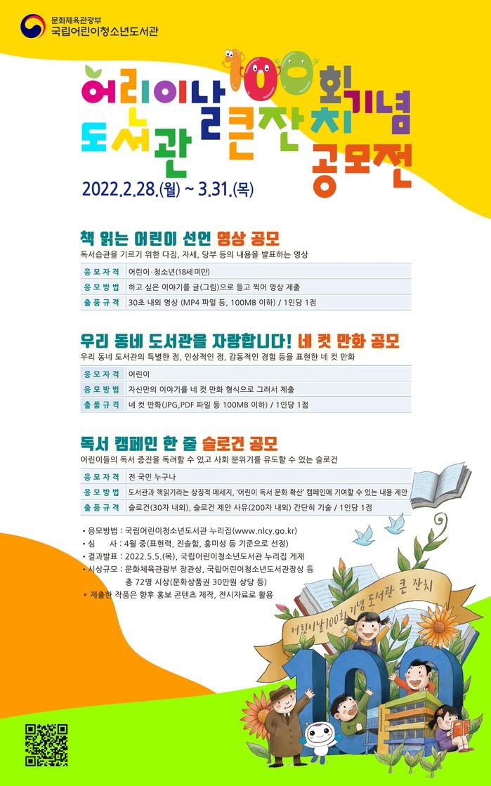| ▲ 「어린이날 100회 기념 도서관 큰 잔치」 온라인 공모전 포스터 (사진제공=국립어린이청소년도서관) |