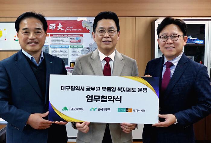 현대백화점그룹 계열 토탈복지솔루션 기업 현대이지웰은 대구광역시, 아이엠뱅크와 '대구광역시 공무원 대상 맞춤형 복지제도 운영'을 위한 업무협약을 체결했다고 8일 밝혔다.