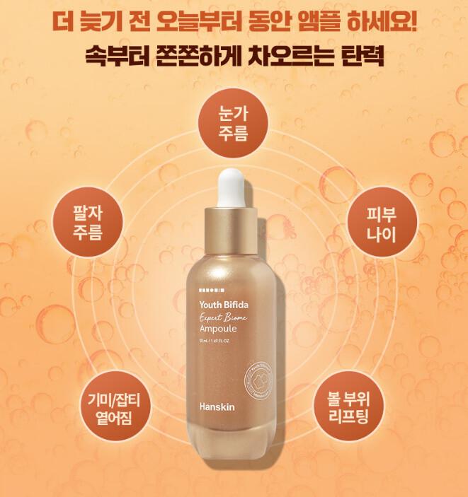 브랜드 측에 따르면 ‘어린 비피다 엑스퍼트 바이옴 앰플’은 4주 간의 인체적용시험에서 강력한 토탈 안티에이징 효과가 입증된 한스킨의 대표 아이템이다.