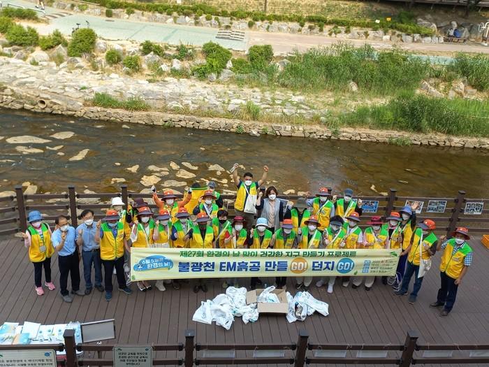 ‘EM 흙공 던지기’는 EM발효액과 황토를 섞은 EM흙공이 하천에서 서서히 녹으면서 수질이 정화되고 악취가 개선되는 수질개선 캠페인으로, 구 탄소중립 실천단 구민 30명이 불광천 생태체험관에서 EM흙공을 직접 만드는 체험을 하고 불광천에 던지는 활동에 참여했다.