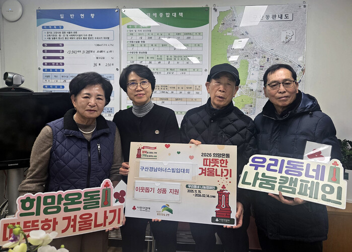 배경미 구산동장은 “항상 지역사회를 위해 나눔과 봉사를 실천해 주는 구산동 경남아너스빌 입주자대표회의에 깊이 감사드린다”며 “보내주신 성금은 취약계층을 위해 소중히 사용되도록 잘 전달하겠다“고 밝혔다.
