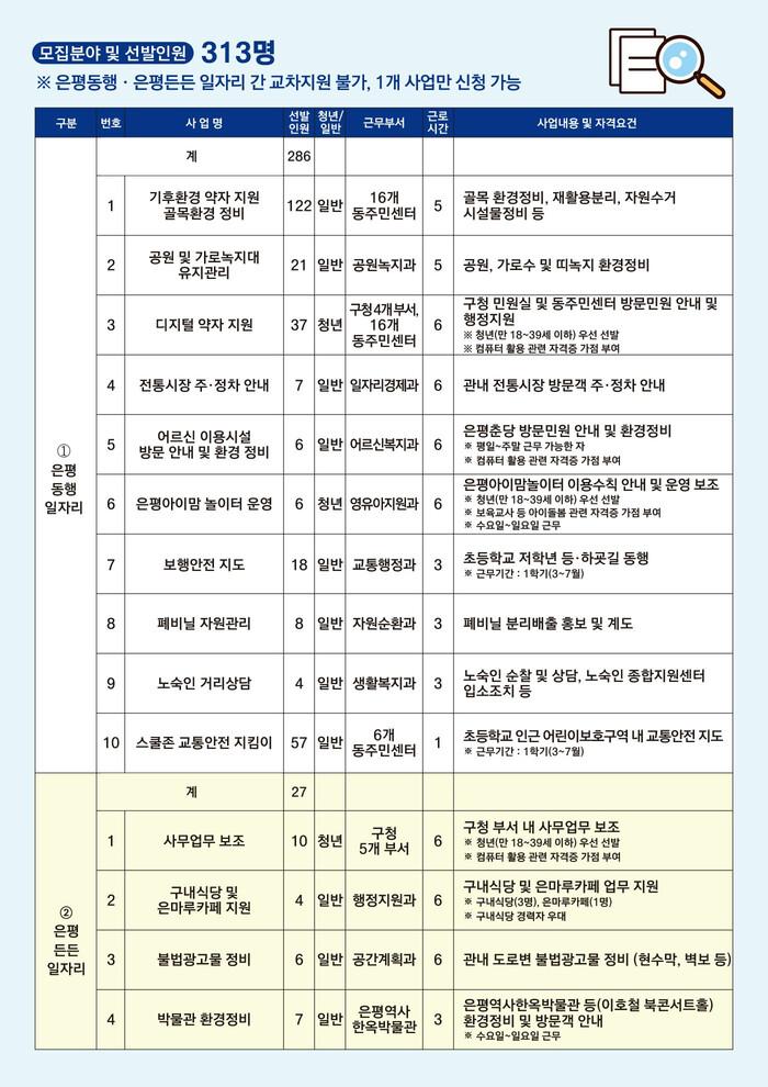 모집 기간은 오는 24일부터 내달 5일까지로, 총 12일이다. 모집 인원은 ▲은평동행 일자리 286명 ▲은평든든 일자리 27명으로 총 313명이다.