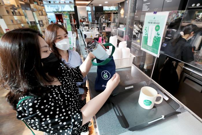 | ▲ 구청 직원들이 점심 식사 후 카페에서 커피를 담은 다회용 텀블러를 에코백에 넣고 있는 모습. (사진제공=성동구청) |