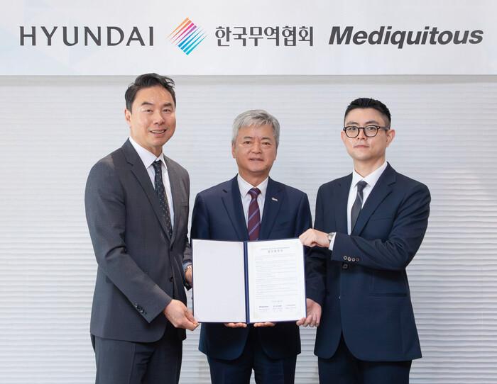 이날 서울 강남구 트레이드타워에서 진행된 협약식에는 정지영 현대백화점 사장과 이인호 한국무역협회 부회장, 이두진 메디쿼터스 대표 등이 참석했다.