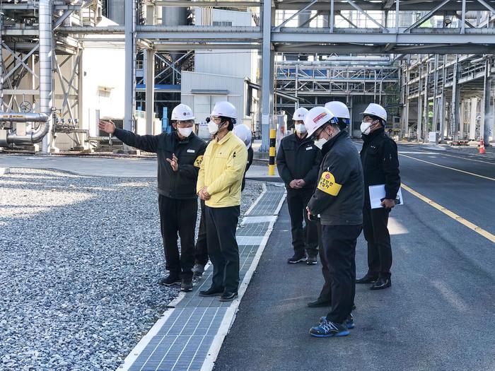 충남 서산시가 8일 서산화학재난방재센터, LG화학 등 대산산단의 환경·화학 사고 안전분야 현장 점검에 나섰다. 사진은 이날 구상 부시장(왼쪽 두 번째)과 관계자들이 LG화학을 방문해 RTO 시설을 점검하는 모습. (사진제공=서산시청)