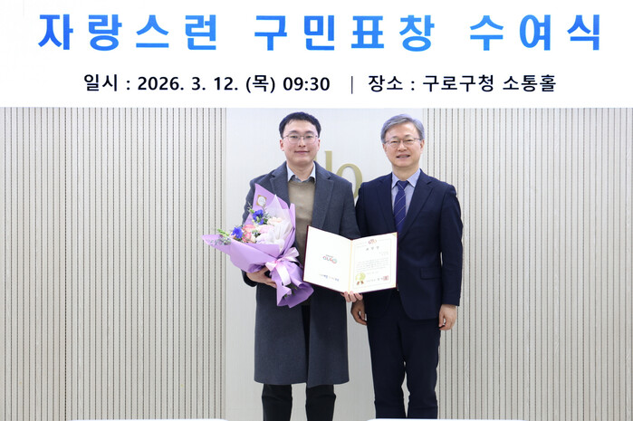 서울 구로구가 12일 구청 소통홀에서 구민의 생명 구조에 기여한 정귀현씨에게 ‘자랑스러운 구민표창’을 수여했다. 사진은 수여식에서 정씨가 장인홍 구청장(오른쪽)으로부터 표창장을 전달받고 기념촬영을 하는 모습. (사진=구로구청 제공)