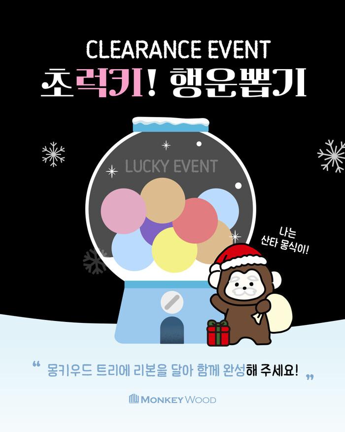 이번 클리어런스 이벤트는 단순 판매를 넘어 고객들에게 특별한 경험을 제공하기 위한 다채로운 참여형 이벤트로 구성되어 눈길을 끈다. 주요 이벤트로는 '산타 몽식이와 함께하는 꽝 없는 초럭키! 행운 뽑기 이벤트'가 있다. 1층에서 몽키우드의 캐릭터인 산타 몽식이와 함께 크리스마스 트리를 완성하고 이를 개인 SNS에 공유한 방문객에게 2층 행운 뽑기 존에서 경품 획득의 기회를 부여한다. 경품 목록에는 몽키우드 30만원 할인권(행사장 내 사용 가능), 루이스폴센 판텔라 테이블 조명, 몽키우드 세라믹 도마, 스타벅스 1만원 기프트카드, 과자 선물 등이 포함된다.