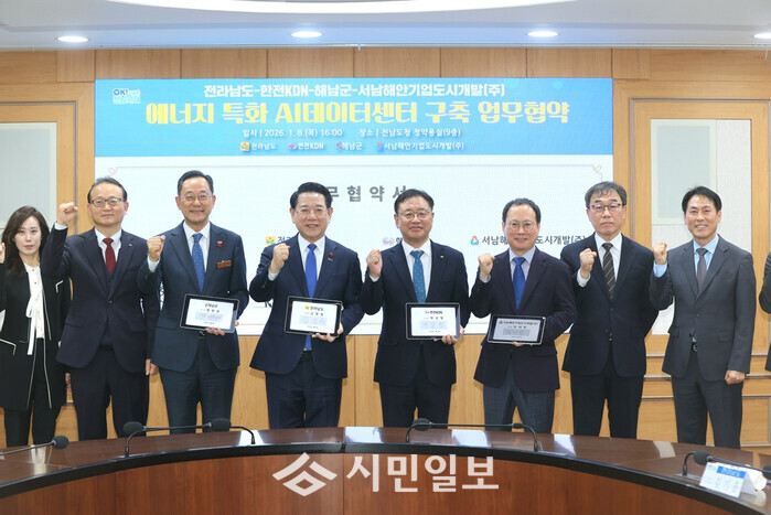 해남군은 8일 전남도-한전KDN-서남해안기업도시개발(주)와 에너지특화 AI데이터센터 구축을 위한 업무협약을 체결했다. 협약식에는 명현관 해남군수를 비롯해 김영록 전남도지사, 박상형 한전KDN 사장, 김대한 서남해안기업도시개발(주) 대표가 참석했다.