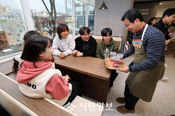 | ▲ 박병규 광산구청장(왼 쪽)이 27일 구청 1층 카페홀더에서 시민들에게 음료를 내고 있다. / 광주광역시 광산구청 제공 |