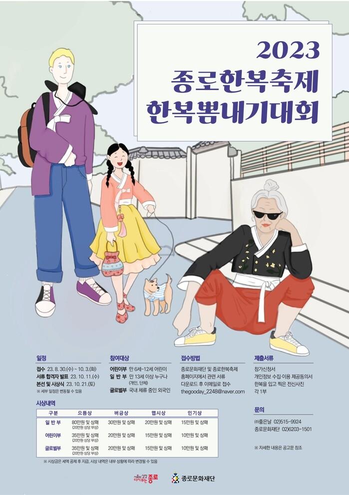 [시민일보 = 이대우 기자] 서울 종로구(구청장 정문헌)가 오는 10월3일까지 종로한복축제를 대표하는 시민참여 프로그램 ‘2023 한복뽐내기대회’ 참가자를 모집한다.
