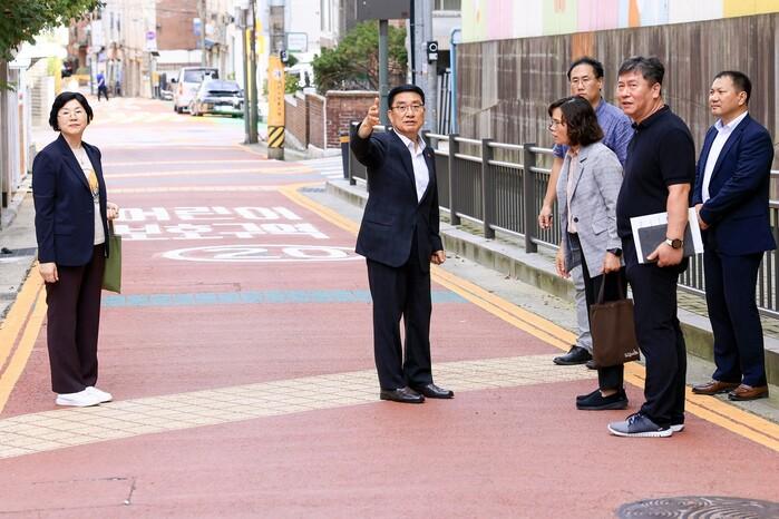 | ▲ 문헌일 구청장이 신규 조성된 스쿨존 532 현장을 점검하고 있다.(사진=구로구청 제공) |
