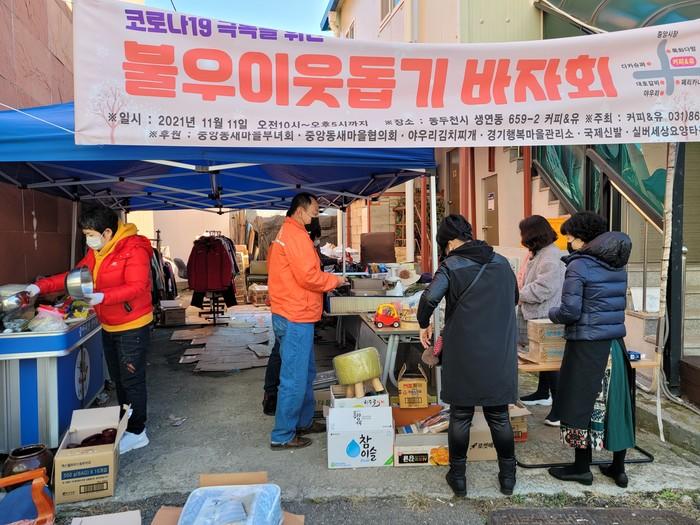 경기 동두천시 생연동 행복마을관리소는 11일 ‘코로나19 극복을 위한 불우이웃돕기 바자회’ 행사를 열어 중앙동 새마을부녀회 등에서 기부한 물품을 모아 판매했다. 수익금은 어려운 이웃을 돕기 위해 전액 시에 기부할 예정이다. 사진은 바자회가 진행되고 있는 모습. (사진제공=동두천시청)