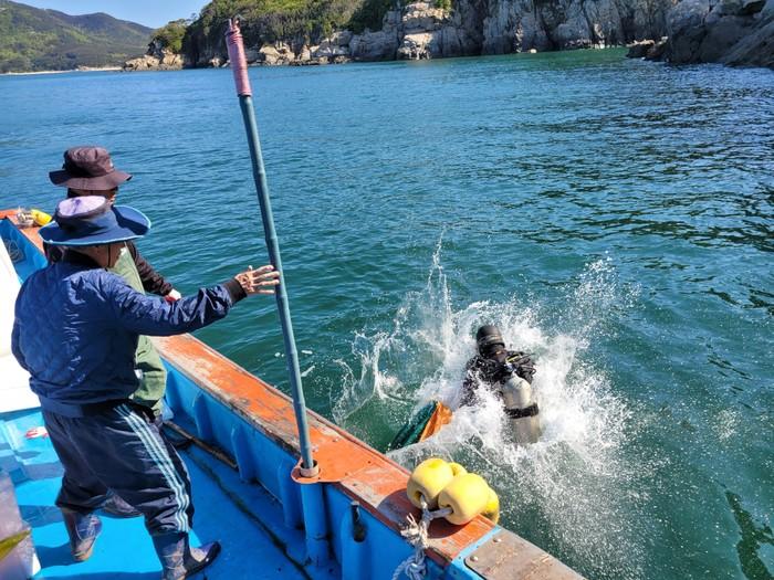 | ▲ 해삼 자원의 조성 및 어업인 소득 증대를 위해 군 관계자들이 어린 해삼을 방류하고 있다. (사진제공=인천 옹진군청) |