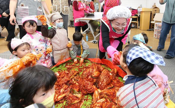 박희영 서울 용산구청장은 27일 용산구자원봉사센터에서 열린 자원봉사캠프 공동프로그램 ‘한마음 김장나눔’ 행사에 참여해 자원봉사자들과 함께 취약계층을 위해 김장을 했다. 사진은 박 구청장이 행사에 참가한 청파어린이집 원아들과 함께 김장을 하고 있는 모습. (사진=용산구청 제공)