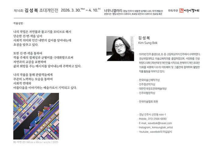 한편 김성복 작가는 진주 출생으로 경상국립대학교 미술교육과를 졸업했으며, 1993년 첫 개인전을 시작으로 서울과 진주, 일본 오사카 등에서 꾸준히 개인전을 개최해왔다. 한국미술 신예작가상, 진주청년작가상, 대한민국창조문화예술대상 등을 수상했다.