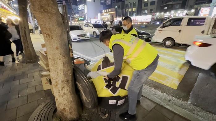 | ▲ 광고물 정비 공무원이 불법광고물을 정비하고 있다. (사진제공=마포구청) |