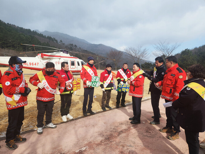 전남 보성군은 겨울철 산불 위험 시기에 대비해 2026년 산불 대응 태세 전반을 점검하고, 범군민 산불 예방 캠페인을 전개했다. 사진은 이상철 부군수와 산림보호 담당자들이 산림재난대응단과 산불 임차 헬기 관계자들이 근무하는 계류장을 방문해 함께 예방 캠페인을 추진하고 있는 모습. (사진=보성군청 제공)