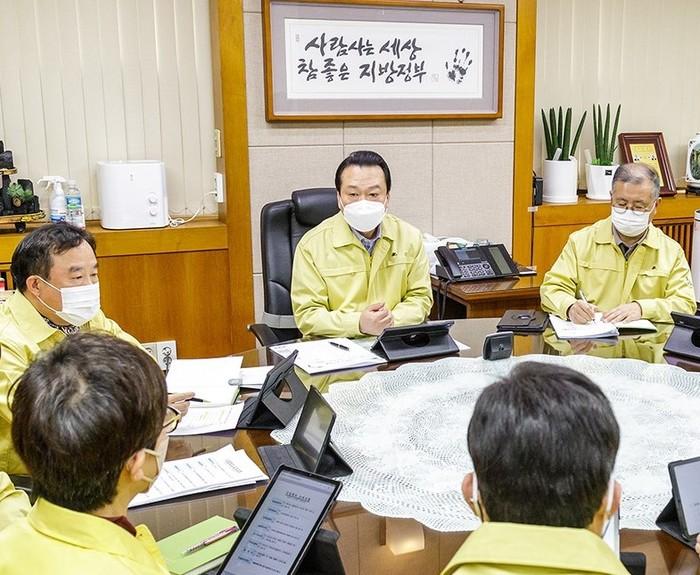 노현송 서울 강서구청장이 8일 오전 구청장실에서 '20대 대통령 선거' 관련 안전하고 공정한 투표사무가 이뤄질 수 있도록 막바지 선거 준비상황을 점검했다. 이날 점검은 지난 사전투표 당시 전국 여러 투표소에서 확진·격리 유권자 중 혼선이 발생한 만큼 본 투표에서는 준비를 철저히 해 혼선이 재발하지 않도록 하기 위해 마련됐다. 사진은 이날 노 구청장(가운데)과 구 관계자들에게 안전하고 공정한 투표사무에 만전을 기하라는 주문을 하는 모습. (사진제공=강서구청)