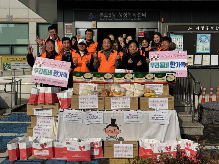 2025년을 마무리하는 12월 일촌맺기 사업에는 사골곰탕과 떡국떡으로 어르신들이 집에서 간편하게 떡국을 끓여 드실 수 있도록 마음을 더했으며, 더불어 홍이네청과에서 과일, 떡두꺼비에서 떡, 파리바게트 안산본오스타점에서 빵을 후원해 더 풍성한 먹거리가 마련됐다. 또한 지역 내 착한가게인 대박통신에서 후원한 물티슈도 전달하며 소외계층 20가구에 이웃의 정을 나눴다.