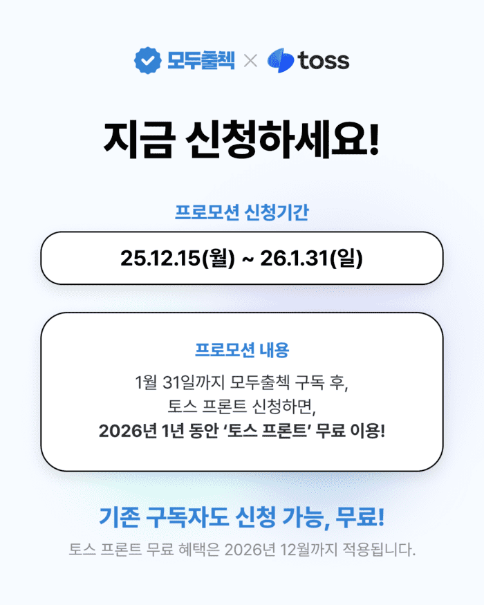 이벤트 기간 동안 모두출첵을 구독하고 토스를 사용하는 고객은, 2026년 한 해 동안 토스 기기 사용료(월 5,000원)가 전액 면제된다. 다만, 앱 구독료와 알림톡 비용은 별도다.