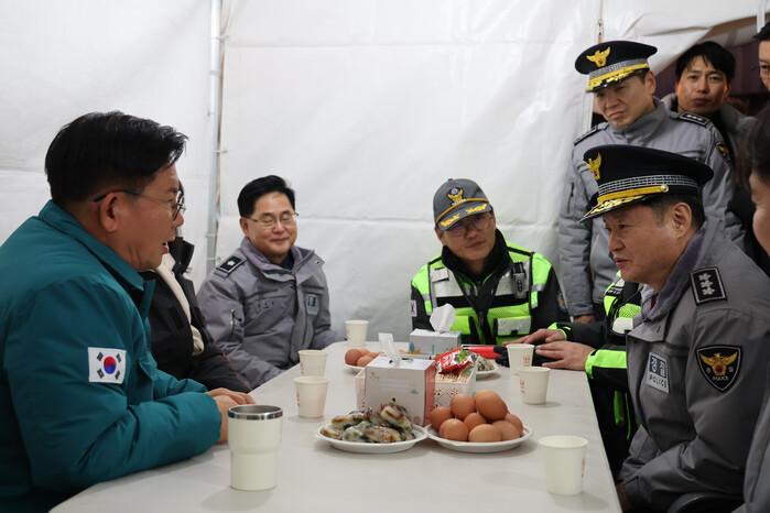 박강수 서울 마포구청장이 지난 24일 레드로드 일대를 찾아 연말연시 다중 인파에 대비한 현장 안전관리 체계를 점검하고, 관계기관과의 공조 대응을 재확인했다. 사진은 마포구 안전관리 합동상황실에서 박 구청장과 박정보 서울경찰청장이 연말연시 현장 안전관리 협력방안을 논의하는 모습. (사진=마포구청 제공)