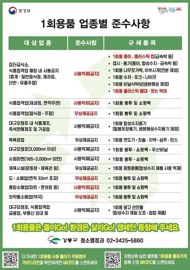 환경부 자원재활용법 개정으로 ▲식품접객업 매장 내 종이 컵, 플라스틱 빨대·막대 사용금지 ▲종합소매업 비닐봉투 사용금지 ▲체육시설 1회용 플라스틱 응원용품 사용금지 ▲대규모점포 우산비닐 사용금지 등 규제품목이 추가됐다.