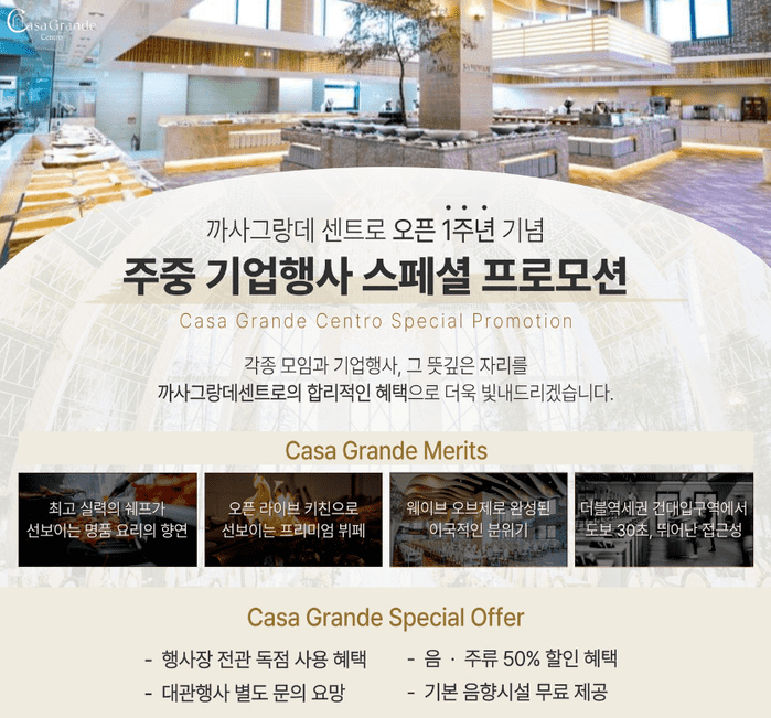 웨딩홀 관계자의 말에 따르면 '광진구 기업행사 대관 장소로써 까사그랑데 센트로의 우수한 접근성 및 고객 니즈를 반영한 맞춤형 행사 진행으로 인기를 얻고 있다'며 '이에 보답하기 위해 이번 오픈 1주년 기념 프로모션을 기획하게 되었다'고 알렸다.