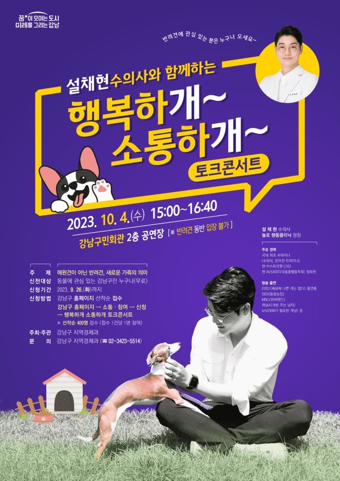 [시민일보 = 이대우 기자] 반려동물 1500만 시대 서울 강남구(구청장 조성명)가 반려동물에 대해 올바르게 이해하고, 반려동물 가정과 이웃이 조화롭게 살아가는 법에 대해 배우기 위해 ‘설채현 수의사와 함께하는 행복하개 소통하개 토크콘서트’를 개최한다고 22일 밝혔다.