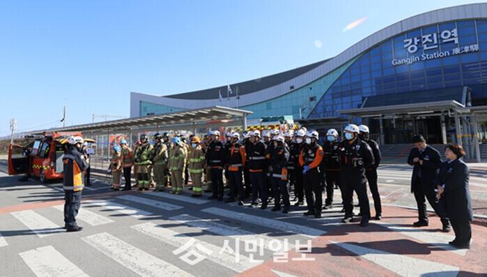 | ▲ 강진소방서, 8일 강진역에서 열차 탈선으로 인한 대형 인명피해와 2차 사고를 가정한 불시 출동 훈련 자료사진 / 강진소방서 제공 |