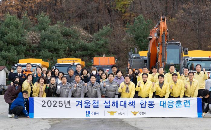 경기 수원시가 겨울철 강설에 대비해 4개 구청, 유관기관, 민간단체와 함께 설해 대책 합동 현장대응 훈련을 하고, 제설 대응·협력 체계를 점검했다. 지난 18일 영통구청 제설 전진기지에서 열린 합동 훈련에는 이재준 수원시장과 4개 구청장, 장안·권선·팔달·영통경찰서, 수원(남부)소방서 관계자, 각 동 제설지원단(주민자치위원, 통장) 등이 참가했다. 사진은 이재준 시장(앞줄 오른쪽 다섯 번째)과 합동훈련 참가자들이 기념촬영을 하고 있는 모습. (사진=영통구청 제공)