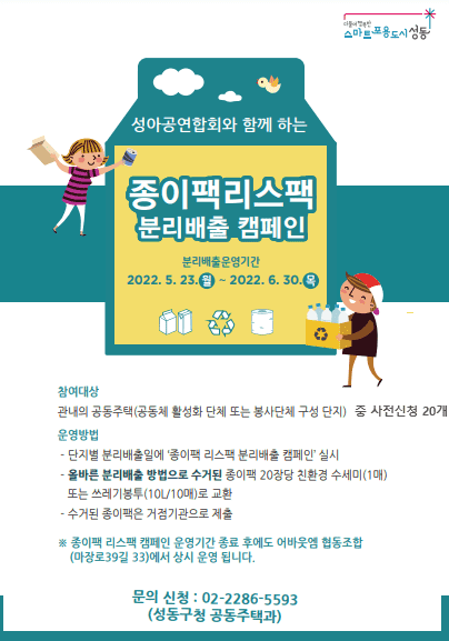 [시민일보 = 홍덕표 기자] 서울 성동구(구청장 정원오)가 이달 말까지 아파트 공동체 활성화단체 연합회의 '종이팩-리스팩 분리배출 캠페인'을 전개한다고 14일 밝혔다.