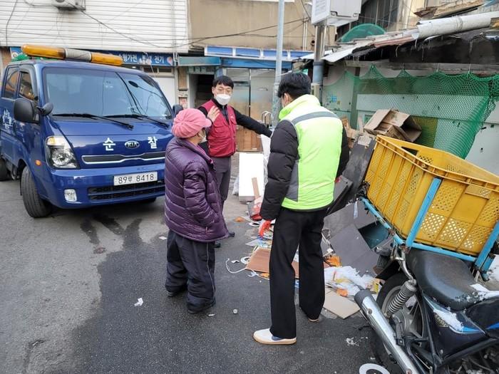 | ▲ 지난 1월20일 용문시장 일대에서 진행된 쓰레기 무단투기 야간 합동단속 모습. (사진제공=용산구청) |