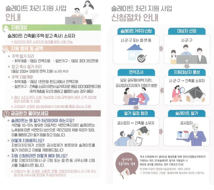 슬레이트 처리 지원 금액은 주택 동(棟)당 최대 352만원(우선지원가구는 전액 지원)이며, 석면해체 면적에 따라 다르다. 다만, 최대 지원 금액을 초과할 경우에는 신청자 자부담이 발생한다.