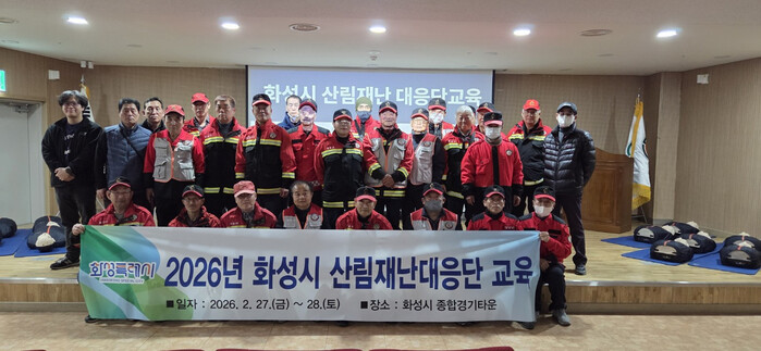 | ▲ 화성특례시 산림재난대응단이 2026년 산림재난대응단 교육을 마치고 기념촬영을 하고 있다 /사진제공=화성특례시 |