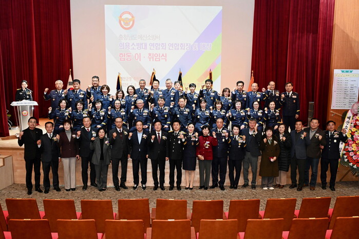 충남 예산군은 예산소방서 의용소방대연합회가 8일 예산군청 추사홀에서 연합회장 및 대장 합동 이·취임식을 개최했다. 사진은 행사에 참석한 최재구 군수(맨 앞줄 왼쪽 여덟 번째)가 관계자들과 함께 기념 촬영을 하는 모습. (사진=예산군청 제공)