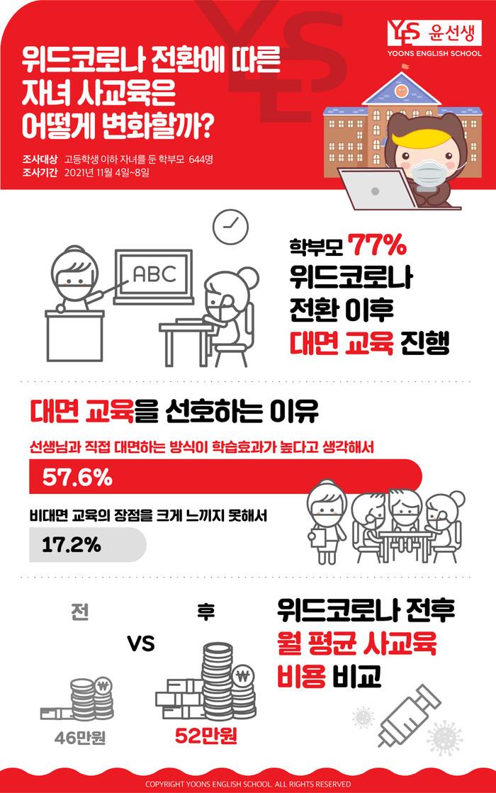 영어교육 전문기업 윤선생은 지난 4~8일 사교육을 진행하고 있는 고등학생 이하 자녀를 둔 학부모 644명을 대상으로 위드코로나 전환에 따른 자녀 사교육 변화에 대한 설문조사를 진행한 결과, 응답자의 77.0%는 대면 교육으로만 사교육을 진행(26.1%)하거나 비대면수업과 병행하더라도 대면 교육의 비중을 확대(50.9%)할 것으로 응답했다.