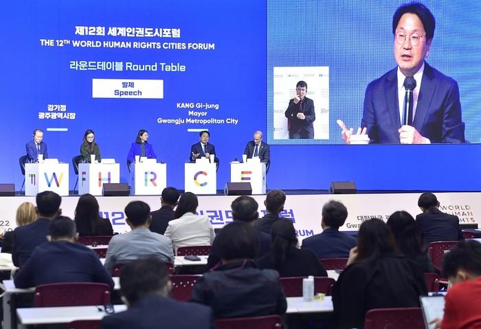 | ▲ 강기정 광주광역시장이 10일 오후 서구 김대중컨벤션센터에서 열린 '제12회 세계인권도시포럼'에 참석해 개회사를 하고 있다./광주광역시 제공 |