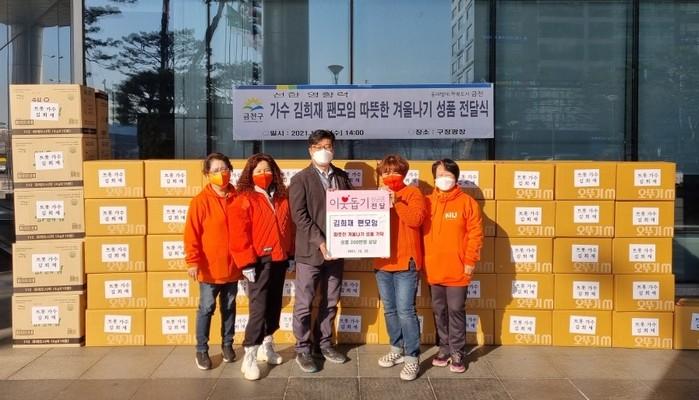 서울 금천구는 지난 22일 가수 김희재 팬모임 ‘희랑별’로부터 독산2동 취약계층을 위한 라면 100상자·김 10상자, KF94마스크 500장을 후원받았다. 후원 물품은 독산2동 주민센터를 통해 지역 저소득층에 전달될 예정이다. 사진은 전달식에서 관계자들이 기념촬영을 하는 모습. (사진제공=금천구청)