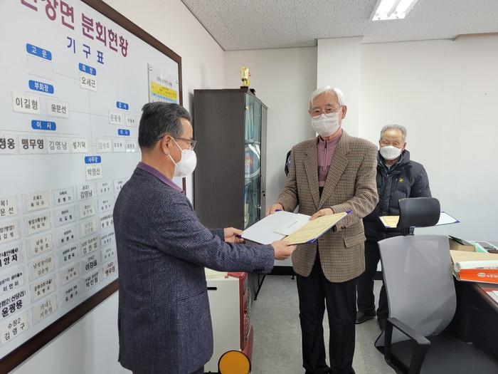 (사)대한노인회 아산시지회 신창면분회는 23일 '2021년 행복나눔 지원금' 전달식을 열고 신창면에 거주하는 어려운 노인 14명(인당 30만원)을 선정해 총 420만원의 지원금을 전달했다. 사진은 전달식에서 대상 노인에게 지원금을 전달하고 있는 모습. (사진제공=아산시청)