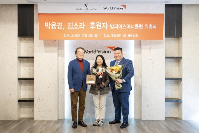 | ▲ (왼쪽부터) 조명환 월드비전 회장, 김소라, 박융겸 후원자가 위촉식 이후 기념사진을 남기는 모습. (사진 제공=월드비전) |