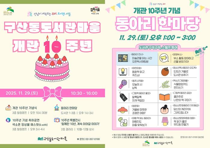 이순임 구산동도서관마을 관장은 “구민들의 서명운동으로 시작해 주민참여와 민·관 협치를 통해 탄생한 도서관이 어느덧 주민과 함께 성장한 10년이 됐다”며, “주민과 함께하는 이번 기념행사를 통해 앞으로의 10년도 구민들과 함께 그려가겠다”고 전했다.