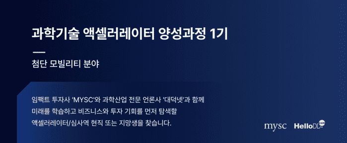 한편, ‘제1기 과학기술 액셀러레이터 양성과정’은 12월 18일(목)부터 MYSC가 운영하는 교육 플랫폼 ‘MYSClass’를 통해 신청할 수 있다. 오는 1월 6일(화)에는 온라인 Q&A 웨비나가, 1월 8일(목)에는 오프라인 워크숍이 예정되어 있다. 자세한 내용은 신청 페이지에서 확인할 수 있다.