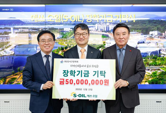 서울 강서구가 22일 에쓰오일(S-OIL)로부터 장학기금 5000만원을 전달받았다. 이날 기탁받은 장학기금은 (재)강서구장학회를 통해 기초생활수급자, 한부모 가정 등 저소득층 가정 자녀들의 학업 지원을 위해 쓰인다. 사진은 전달식에서 진교훈 구청장(왼쪽)이 김광남 총무부문장, 송진수 강서구장학회 이사장이 기념촬영을 하고 있는 모습. (사진=강서구청 제공)