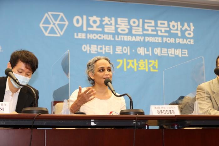 최근 서울 중구 프레스센터에서 제4·5회 ‘이호철 통일로문학상’ 기자회견이 열렸다. 이번 기자회견에는 제4회 수상자 인도의 아룬다티 로이와 제5회 수상자인 독일의 예니 에르펜베크가 함께 참석했다. 사진은 기자회견을 하고 있는 아룬다티 로이의 모습. (사진제공=은평구청)