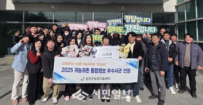 | ▲ 강진군, 농림축산식품부 주관 ‘2025 귀농귀촌 통합정보제공 우수 시군 운영 성과평가’에서 장려상 수상 기념촬영 / 강진군 제공 |