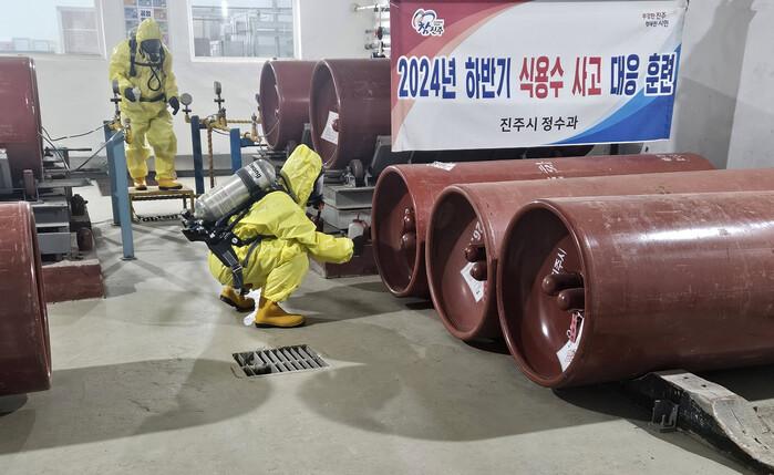진주시는 지난 12일 제2정수장에서 염소가스 누출에 대비한 ‘식용수 사고 대응 훈련’을 실시했다고 밝혔다.